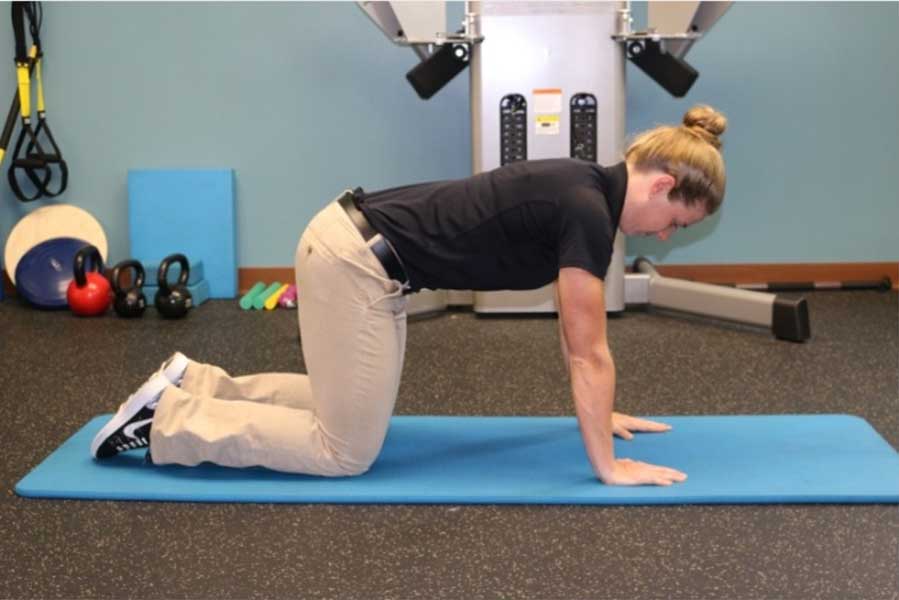 - Engage your abdominals and raise your body off the ground onto your elbows and knees.