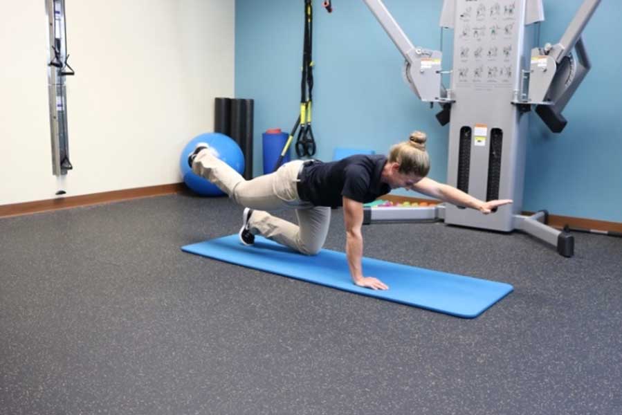 - While abdominally bracing, slowly extend your right leg and left arm into a fully straightened “bird dog” position.