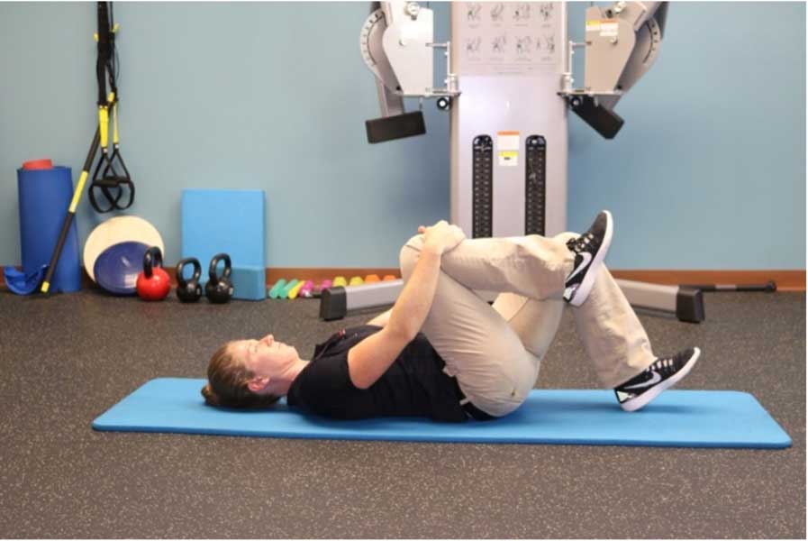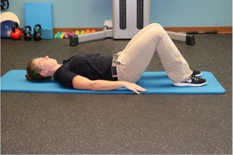 - Lay on your back on an exercise mat or the floor in a bent-knee position with your feet flat on the floor.