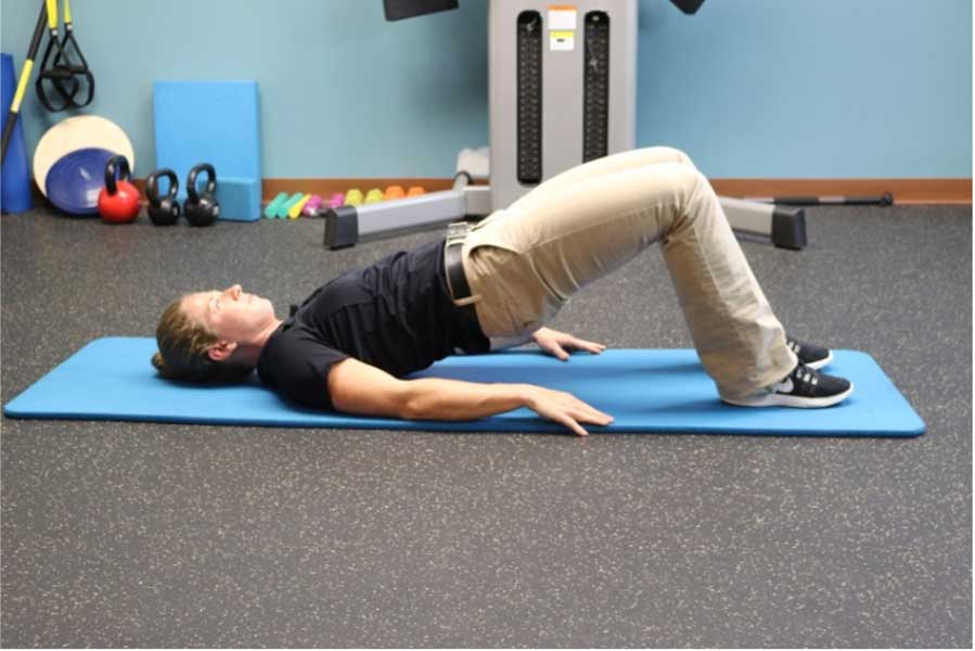 - Gently exhale. Keep the abdominals engaged and, pressing through your heels, lift your hips up off the floor until your body is in a straight line between your knees and shoulders.