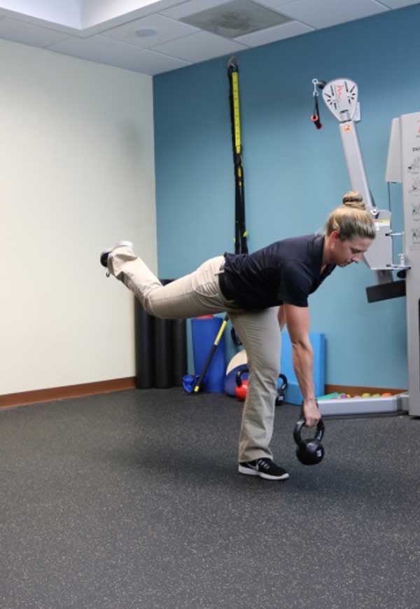 - Transfer your body weight to the leg opposite the arm holding the weight with your knee bent only slightly.